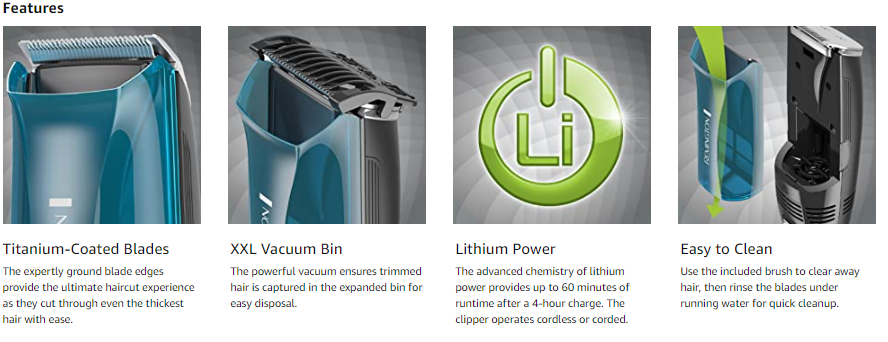 Haircuts at home without the messy cleanup! The Remington Lithium Power Series Vacuum Haircut Kit combines our best technology into one clipper. The lithium ion battery provides consistent power to titanium-coated blades and to the powerful vacuum that keeps trimmed hair off your floor. The kit includes length-adjusting combs, barber scissors, and tapering combs to put the finishing touches on personalized haircuts. Plus, a cleaning brush and blade oil keep the clipper working at top performance through every haircut.