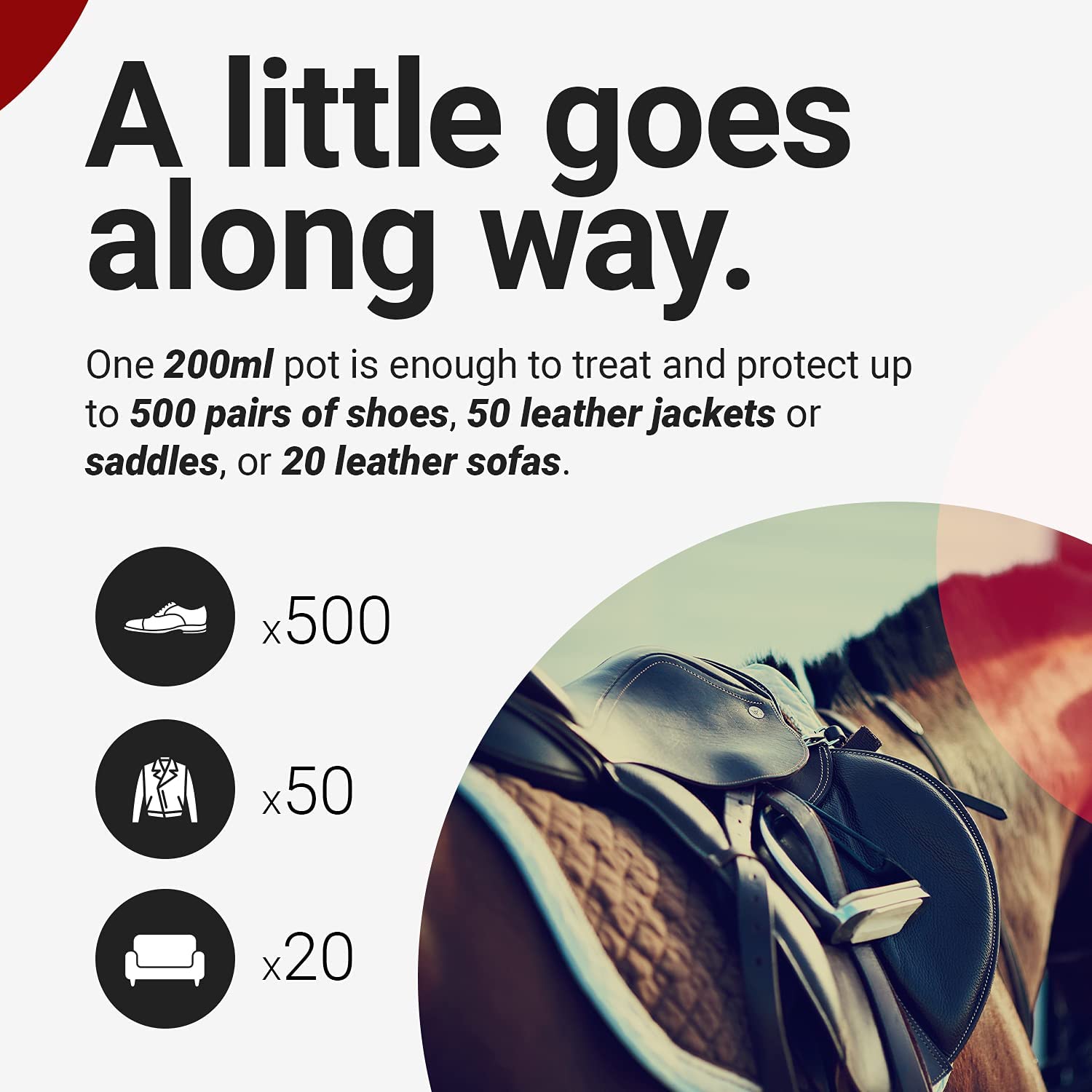Renapur Leather Balsam is made from a blend of waxes and oils including: Beeswax, Carnauba wax, Avocado oil, and Jojoba oil. Our formula is unique and long-lasting so you don't have to worry about running out! One 200ml pot is enough to treat and protect more than 500 pairs of shoes, 50 leather jackets or saddles, or 20 leather sofas.
