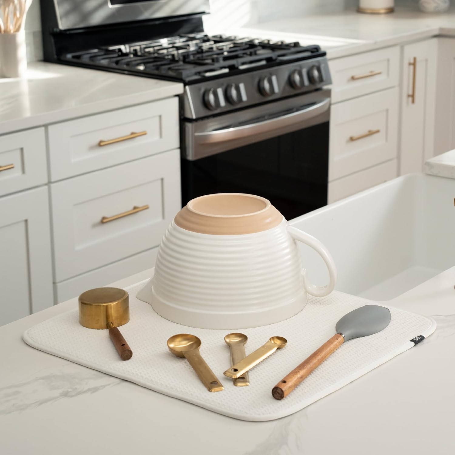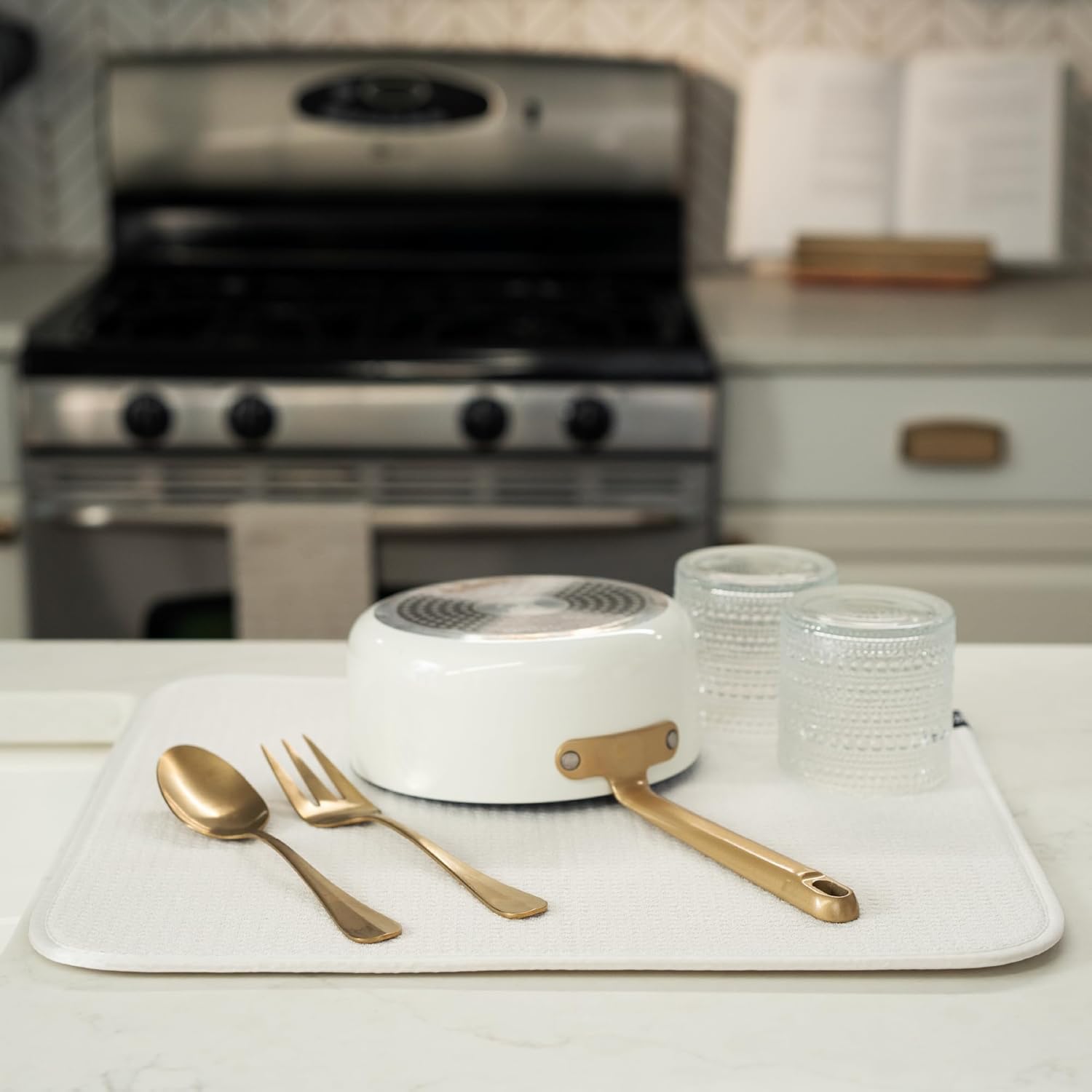 This 16" x 18" S&T INC. microfiber dish drying mat absorbs up to 4 times its weight in water, keeping countertops dry unlike silicone or stone mats. It cushions delicate dishes and glasses, protects surfaces from scratches, and is reversible for extended use. Place it under a dish rack or directly use it for drying plates, utensils, pots, and pans. Also works as an appliance slider for blenders or mixers. Reusable, machine washable, and easy to store—perfect for organized, efficient kitchens.
