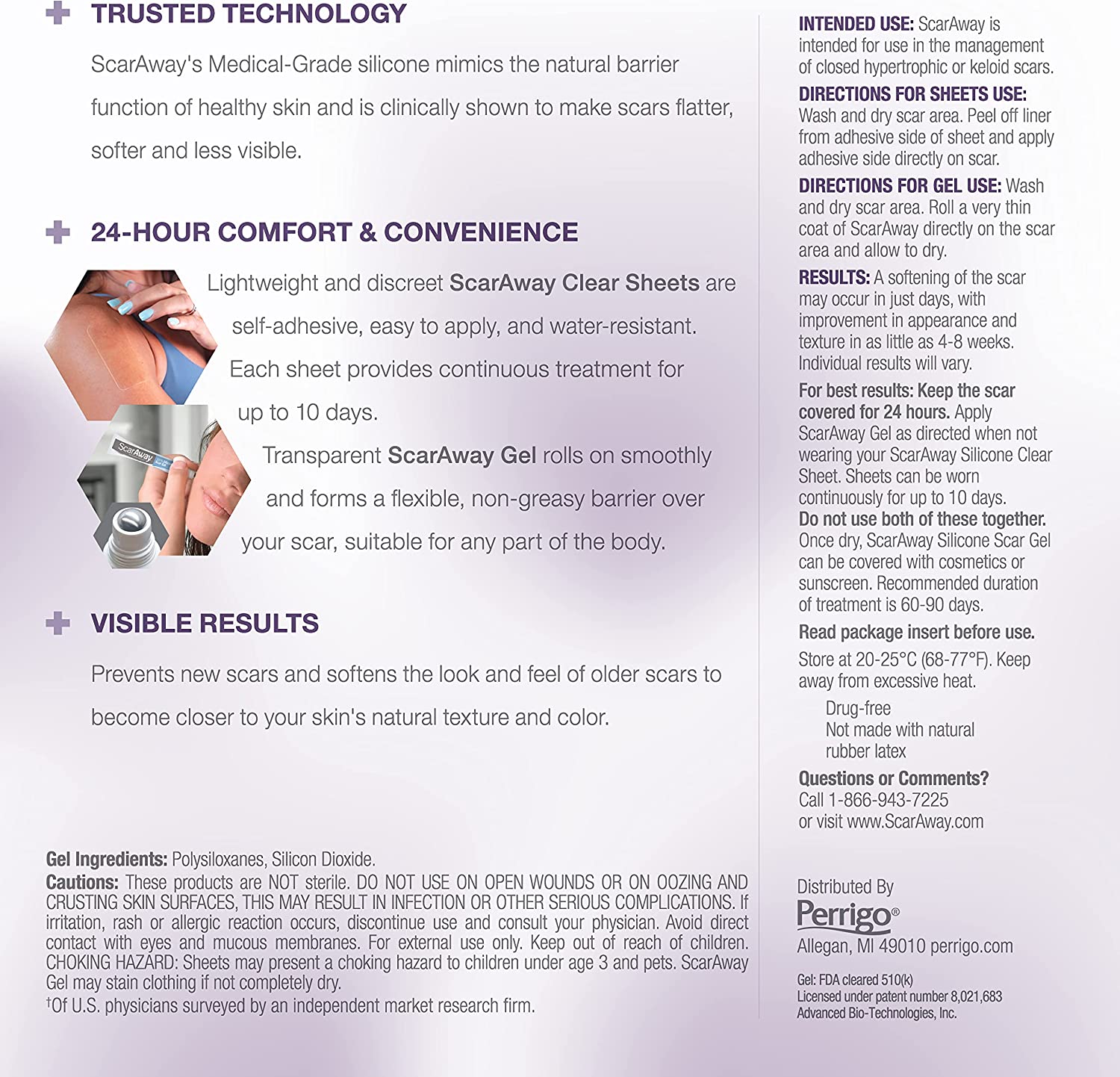 - TRUSTED TECHNOLOGY: ScarAway's Medical-Grade silicone mimics the natural barrier function of healthy skin and is clinically shown to make scars flatter, softer and less visible.