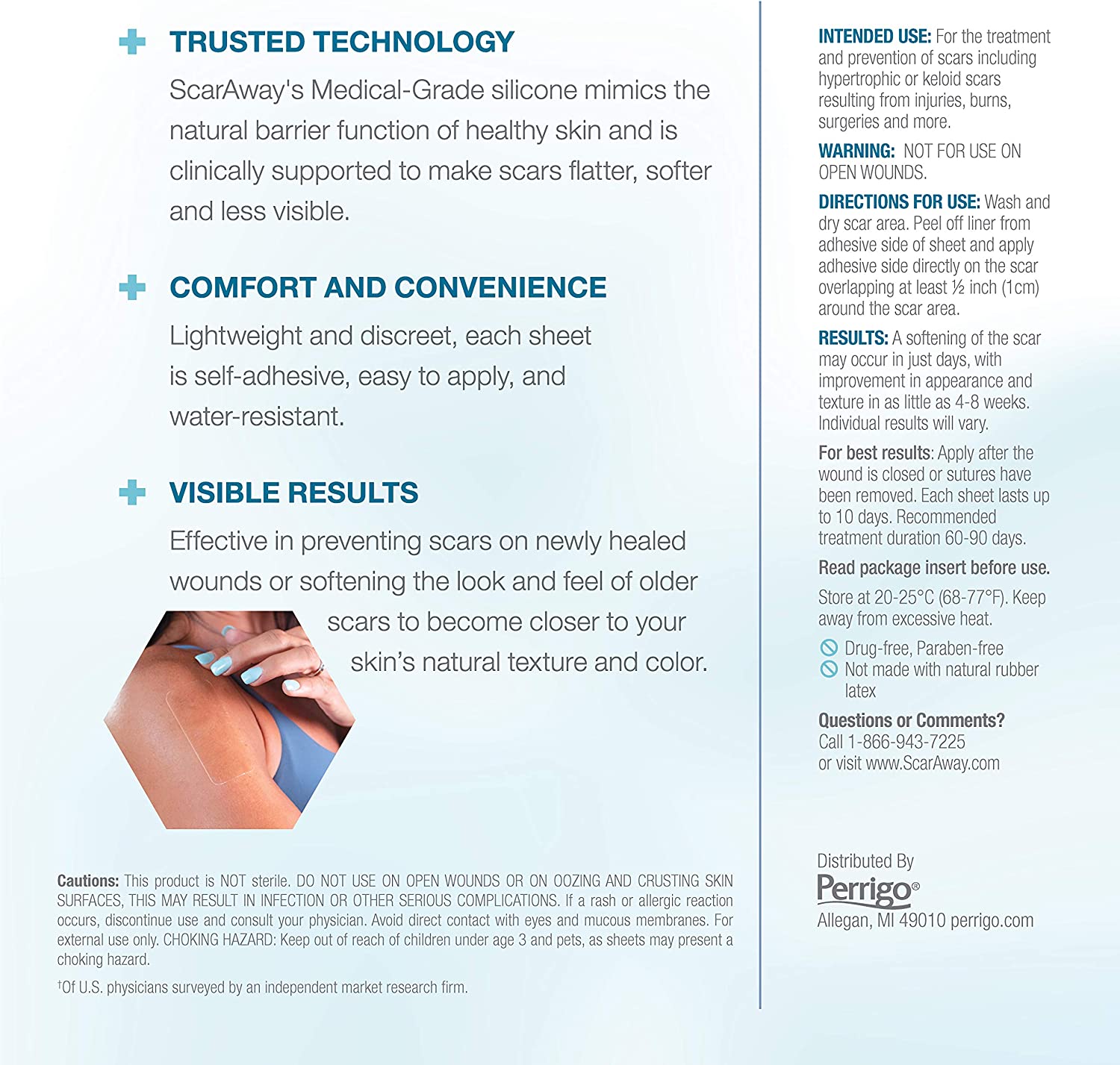 - Soften old and new scars: ScarAway Clear silicone scar sheets improve the appearance of old and new scars. A softening of the Scar may occur in just days, with improvement in appearance and texture in as little as 4-8 weeks. Individual results will vary.