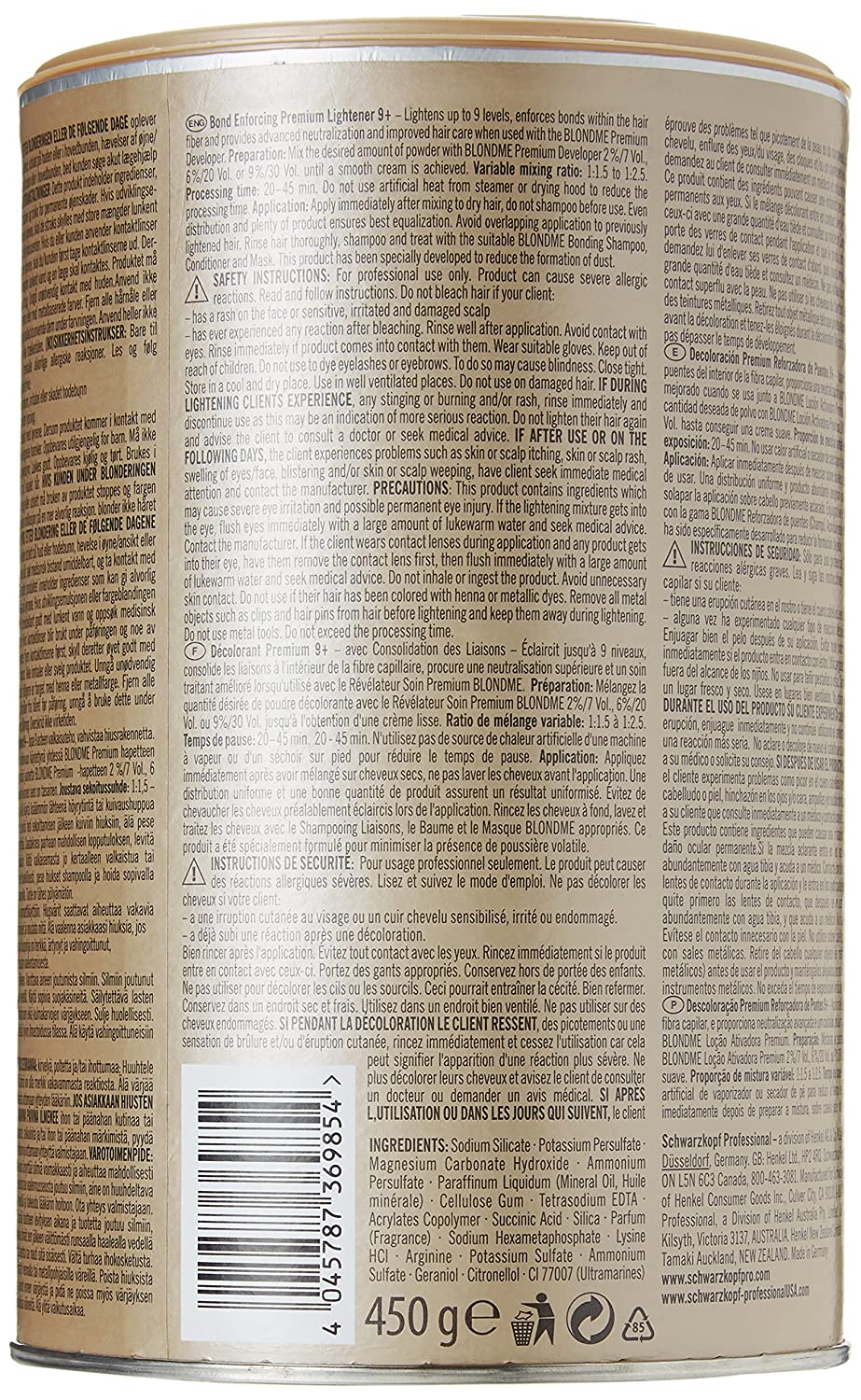 What it is: Schwarzkopf blonde Premium Lift 9+ is a powder lightener with unrivaled performance that's able to lift both natural and colored hair up to 9 levels. What it does: It offers perfect neutralization, thanks to its anti-yellow agents which directly target the hair pigment that causes those warm yellow undertones. What else you need to know: It has a flexible mixing ratio (between 1:1.5 and 1:2.5), which means you can mix it to the consistency that works best for you, and should be mixed with BLONDME Premium Care Developer for optimum bleaching and hair care.