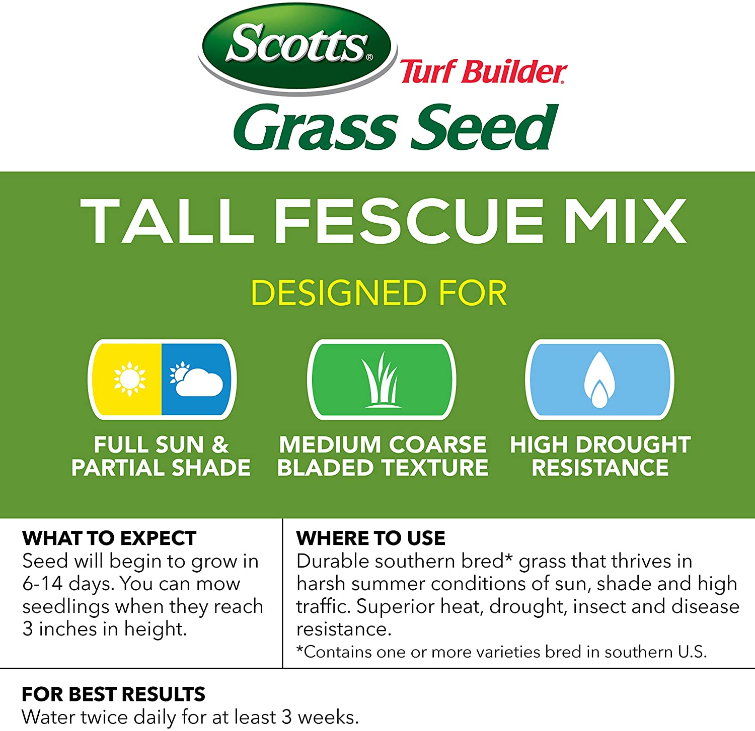 Scotts Turf Builder Grass Seed Tall Fescue Mix provides superior heat, drought, insect and disease resistance to lawns. The mix contains Southern-bred grass seed that thrives in harsh conditions like sun, shade, and high traffic. The exclusive 4 in 1 WaterSmart® PLUS Coating absorbs 2x more water than uncoated seed, feeds with essential nutrients and helps protect seedlings from disease. Grow Quicker, Thicker, Greener Grass. Guaranteed.