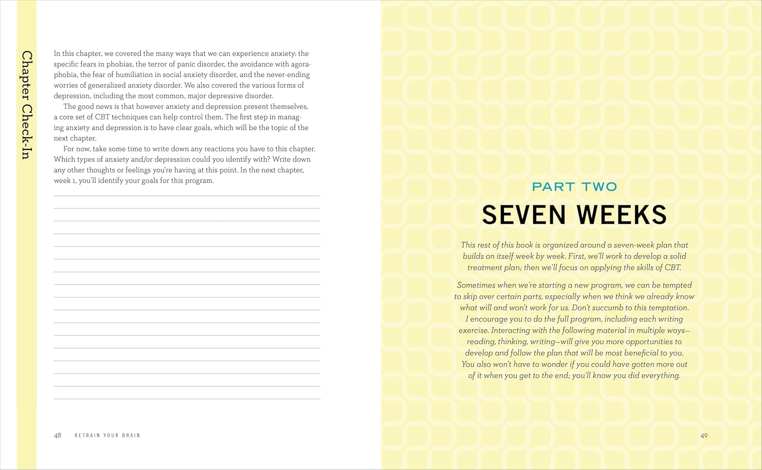 Retrain Your Brain: Cognitive Behavioral Therapy in 7 Weeks by Seth J. Gillihan, PhD, is a practical workbook designed to help manage depression and anxiety using Cognitive Behavioral Therapy (CBT) techniques. Over seven weeks, the book provides step-by-step exercises to help change negative thought patterns and improve emotional responses. Based on scientific research, it guides readers through evidence-based strategies to build resilience and mental well-being. Ideal for those seeking a self-help approach to managing mental health challenges.