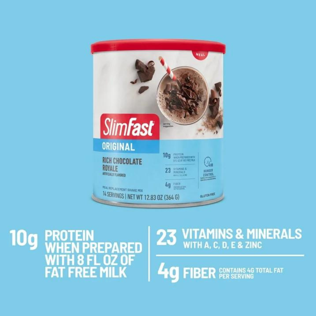We're rolling out the red carpet for chocolate royalty. Original Rich chocolate Royale shake mix is the trusted OG meal replacement that only tastes off limits. That's because this creamy, classic shake mix generously provides 10g of filling protein for four hours of hunger control.† With 4g of fiber and 24 vitamins and minerals, dive into this decadent flavor indulgence without compromise. Enjoy it blended with milk or added t.o your favorite smoothie recipe. How deliciously convenient. †Satiety was measured in a laboratory-controlled setting.