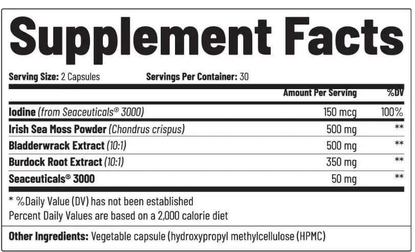 Support healthy thyroid and hormone levels with organic kelp and seaweed compounds. Densely packed micronutrients impart benefits for metabolism and energy production. Irish Sea Moss contains nearly all of the 102 vitamins and minerals our bodies need to thrive! Take 1-2 all-natural SNAP Sea Moss capsules daily with or without food. Some people may find digestion easier with or after meals. Certain medications, like blood thinners or lithium, may cause interactions and consulting your physician for best reference is advised.