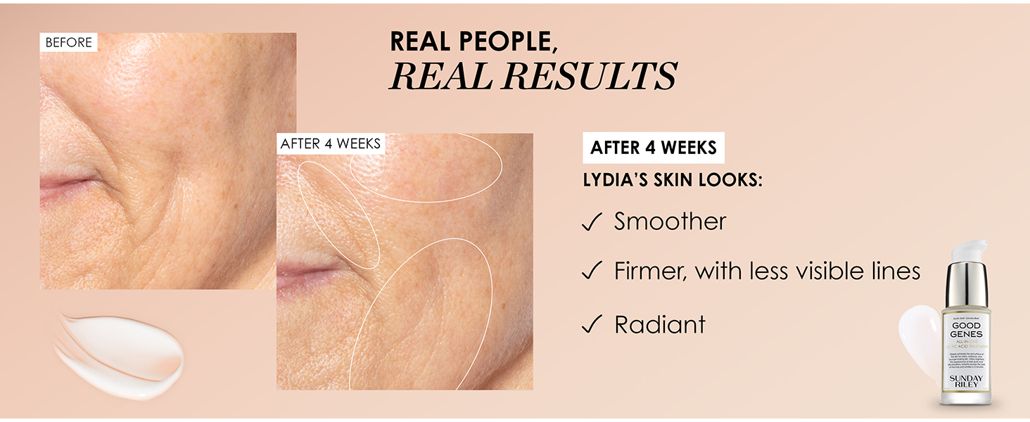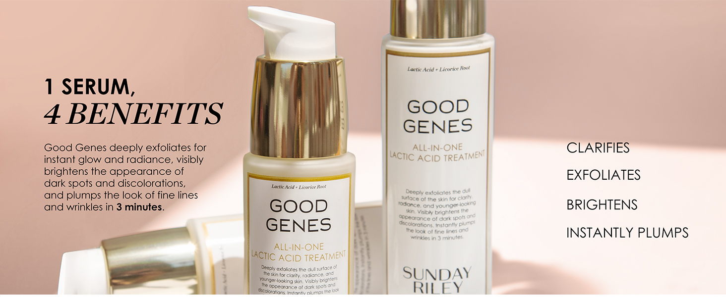 Good Genes deeply exfoliates the dull surface of the skin for instant glow and radiance. As dull, dead surface cells are removed, clarity and smoothness are restored. Good Genes visibly brightens the appearance of dark spots and discolorations and instantly plumps the look of fine lines and wrinkles in 3 minutes. This multi-tasking, targeted lactic acid treatment rapidly exfoliates and boosts naturally youthful radiance, while visibly reducing the look of lines, wrinkles, and dark spots. High potency, purified grade lactic acid exfoliates dull, pore-clogging dead skin cells, to instantly clarify and reveal smoother, clearer skin. Together with skin brightening licorice, this super-concentrated treatment visually reduces the look of dark spots and discoloration caused by exposure to the sun, for naturally brighter, even-toned skin.