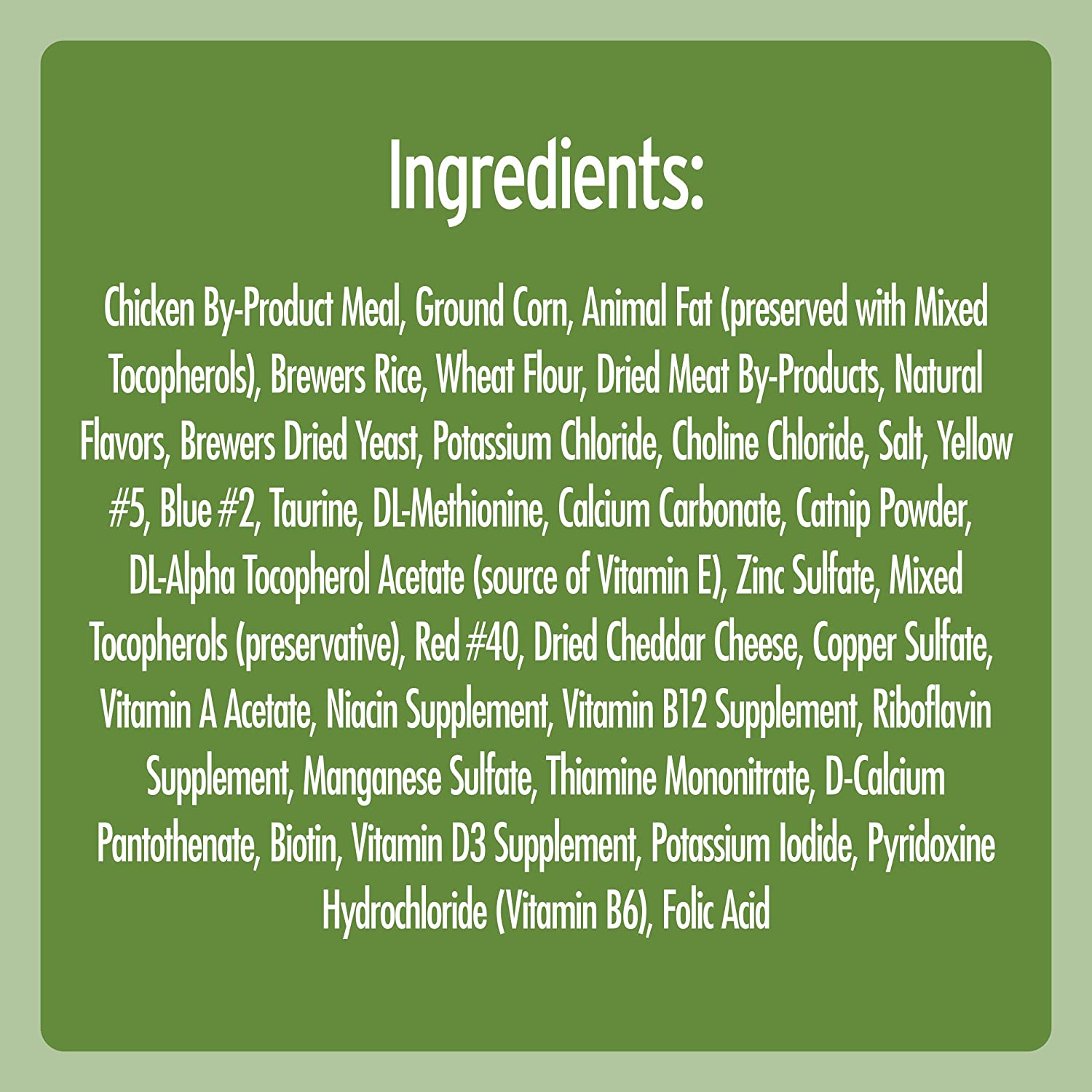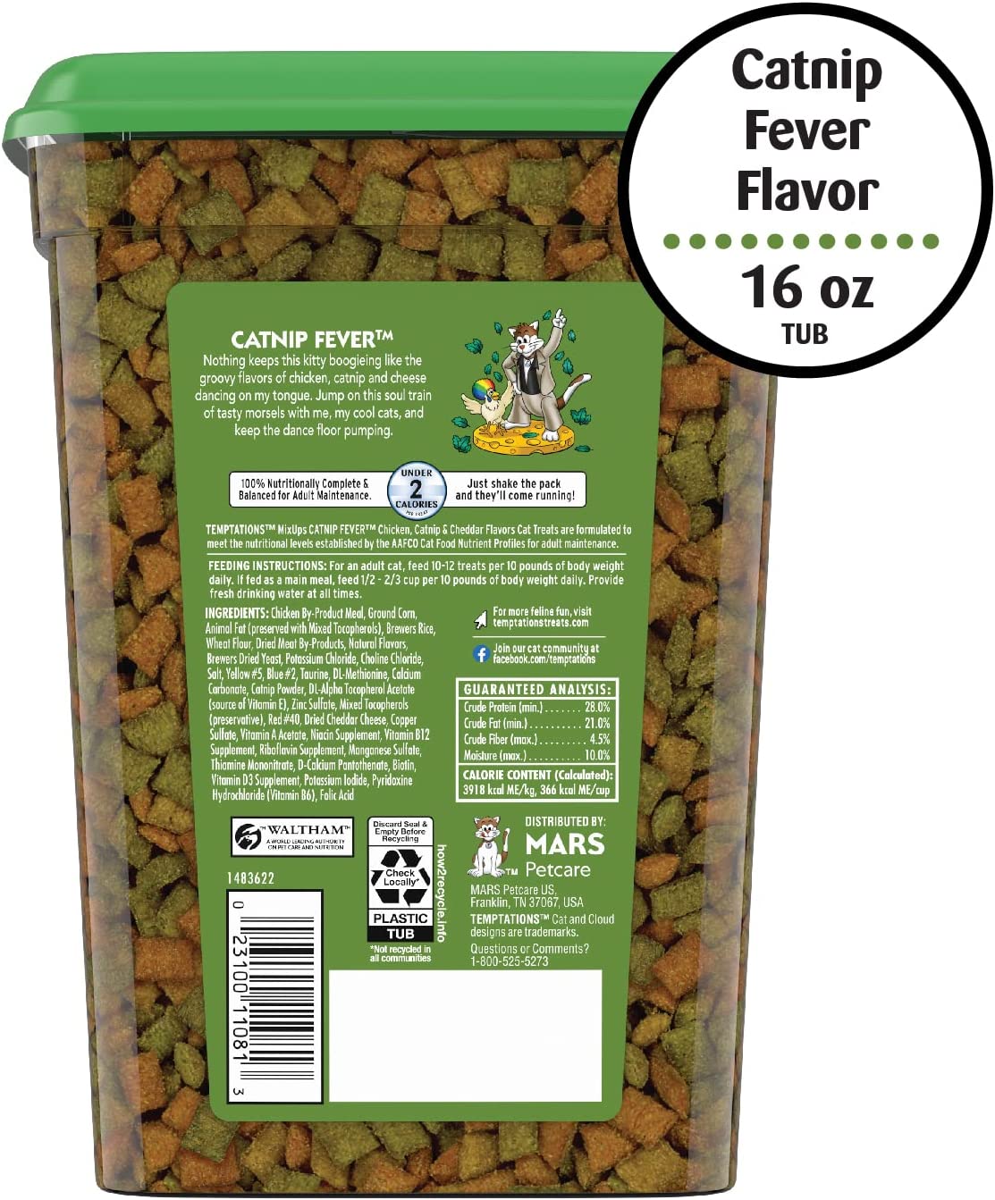 Reward your cat with scrumptious playtime cat snacks that are 100% nutritionally complete for adult cat maintenance and that help to control tartar. Featuring a tempting mix of flavors, such as chicken, catnip and cheese, Temptations MixUps variety cat treats are a great-tasting playtime reward. They're the perfect size treats for cat toys, so try placing a few inside a treat dispenser toy and watch your cat chase and swat away. Plus, at only 2 low calories per treat, your feline friend can enjoy the crunchy outside and soft center anytime.