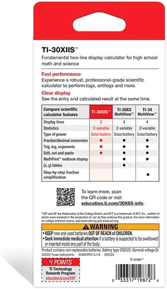 The Texas Instruments TI-30XIIS Scientific Calculator features a dual-line display, allowing you to see calculations and results simultaneously. It performs basic arithmetic, trigonometric, logarithmic, and exponential calculations with ease. Designed with large buttons for quick input, it’s battery-powered for reliable use. The compact, durable design makes it perfect for students and professionals. It also includes advanced features like scientific notation, fractions, percentages, and two-variable statistical calculations.