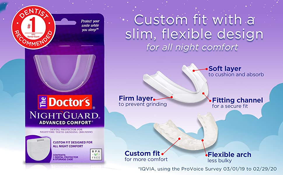 Protecting your teeth from the damaging effects of teeth grinding is easy with the Doctor's night guard, a dental protector for nighttime teeth grinding. The Doctor's night guard was designed by a team of dentists who saw the damage that teeth grinding could do. Over 1,200 prototypes were developed to ultimately select the top-performing advanced comfort design. This premium comfort design is patented and only available from the Doctor's.