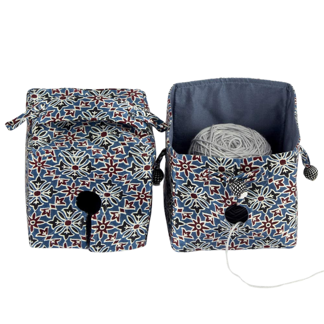 Our popular knit-out box is now available in a sophisticated Ikat fabric that complements all décor. The 5” box was designed to hold and contain individual balls of yarn. A keyhole opening allows yarn to feed out from inside, keeping it free of dirt and entanglement. A closable lid and button-hole closure, with side handles, completes the look of simple elegance.
