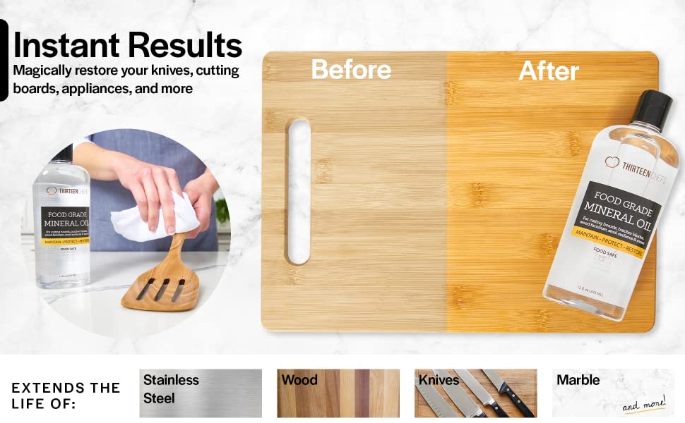 Thirteen Chefs Food Grade Mineral Oil for Wood Cutting Board, Furniture, Steel Surfaces & More, 12 fl.oz / 355 ml