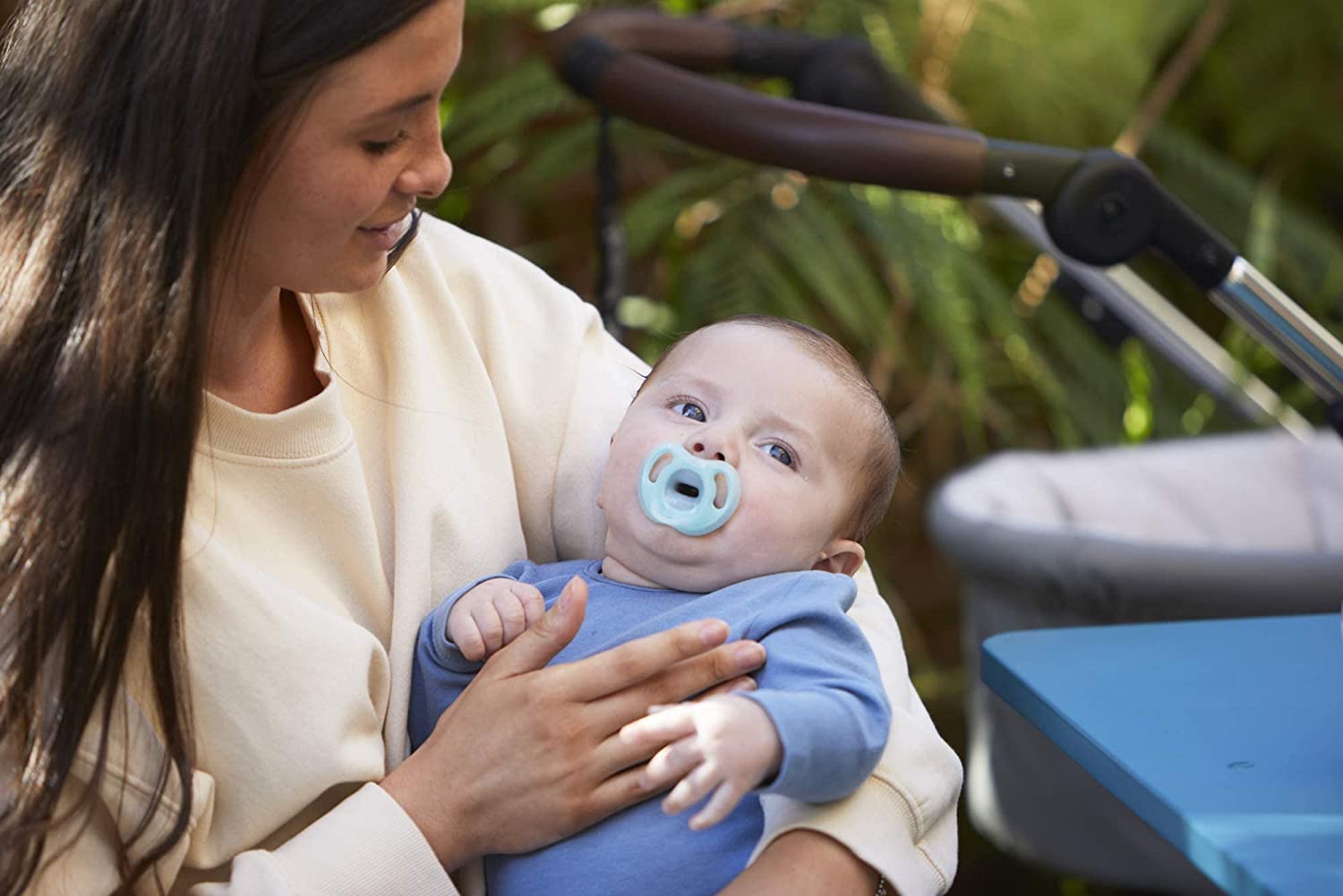 The instinctive action of sucking helps to calm and soothe babies and all parents know there’s nothing more wonderful than a calm, content baby. Little mouths don’t always hold onto heavy baby pacifiers which means parents often need to replace the pacifier in their baby’s mouth every few minutes. Our Ultra-Light Silicone pacifier is our lightest ever pacifier and is light enough to stay put in baby’s mouth for longer helping babies to stay calmer, soothed and happier for longer. As the symmetrical silicone baglet is fully reversible, there is no ‘wrong’ side-up so the pacifier will always be placed correctly in your baby’s mouth, even when they put it in their mouth themselves. The curved shield sits comfortably between baby’s chin and nose and the holes in each side allow extra air flow and prevent the build-up of moisture which helps to protect baby’s delicate skin against irritation. The smooth surface of silicone is very easy to clean and won’t absorb stains and odors. The hygienic, anti-static properties prevent dust from settling and as it has a one-piece design, it is really easy to clean - simply pop in a sterilizer, wash by hand or in the top shelf of the dishwasher.
