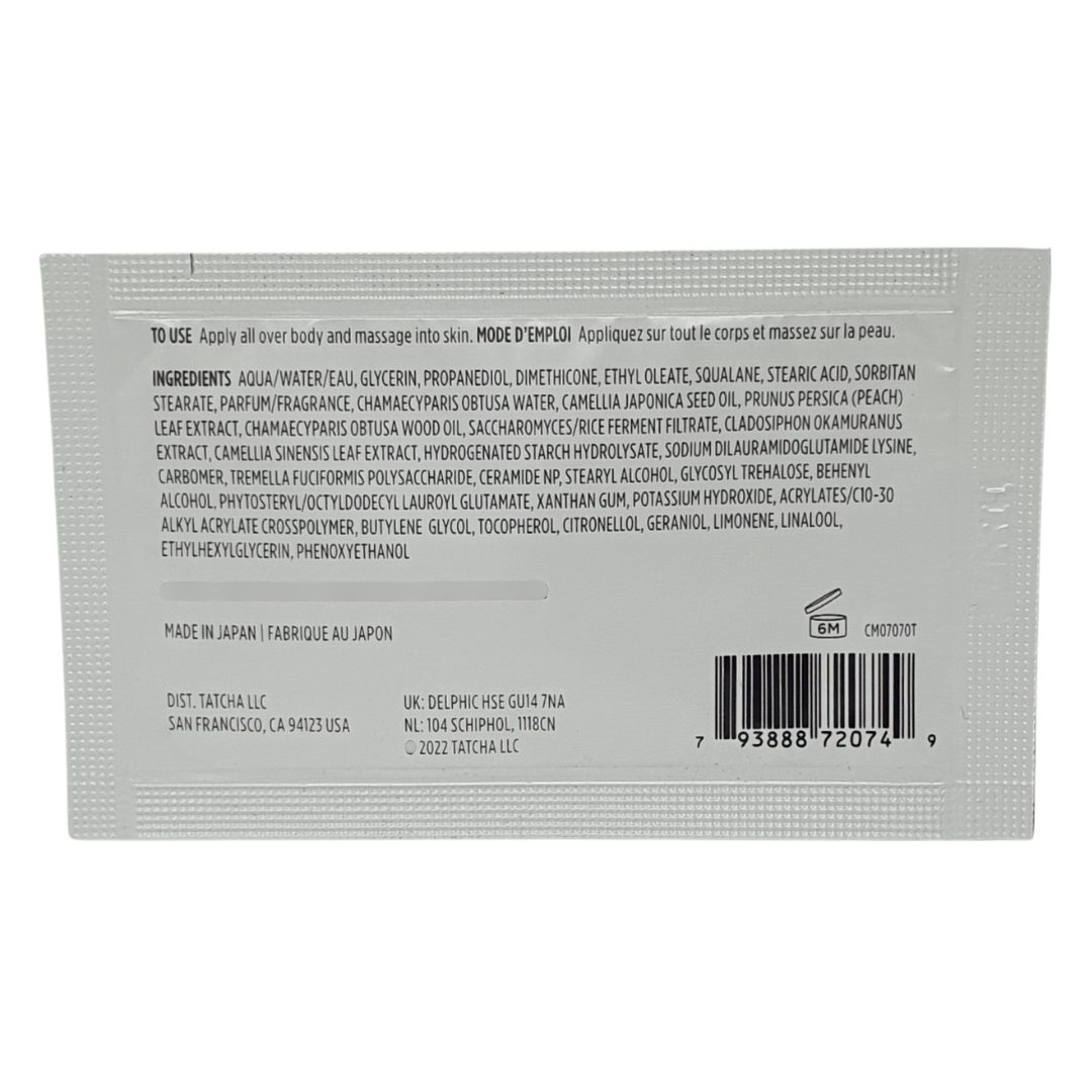 Tatcha Forest Awakening Hinoki Body Milk (Trial Size, 4 mL / 0.13 oz) is a lightweight, milky lotion designed to hydrate and renew dry skin. Inspired by Japanese forest bathing, it features calming essential oils like hinoki, hiba, and cedar, which help uplift mood and provide a soothing aroma. Key ingredients include peach tree leaf extract for skin renewal and plant-derived squalane to lock in moisture, leaving skin soft and smooth. This small travel-friendly size offers a spa-like experience with an earthy, aromatic scent, ideal for sampling before purchasing the full size.