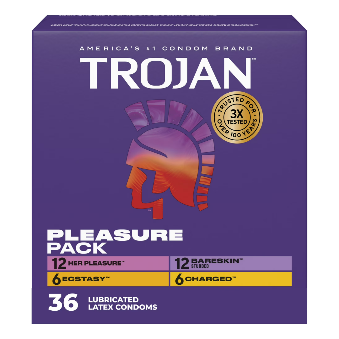 TROJAN Pleasure Pack Assorted Condoms Lubricated Condoms Value Pack features an assortment of TROJAN Brand's most stimulating condoms. TROJAN Pleasure Pack condoms has four varieties to choose from to provide excitement for both partners every time. Whether you're looking for ribbed condoms or condoms for her pleasure, this condoms variety pack has you covered with TROJAN Twisted, TROJAN Her Pleasure Sensations, TROJAN Intense, and TROJAN Warming condoms. Lubricated for comfort and sensitivity, these premium quality latex condoms for men help reduce the risk of unintended pregnancy and sexually transmitted infections (STIs). Each box of condoms variety pack includes 36 TROJAN Brand condoms with four varieties to choose from. TROJAN Brand condoms are America's #1 condom, trusted for over 100 years. TROJAN promotes a safe, healthy, and fun sex life. From condoms to vibrators to lubricants, TROJAN is dedicated to delivering innovative, high-quality products that offer pleasure and protection.