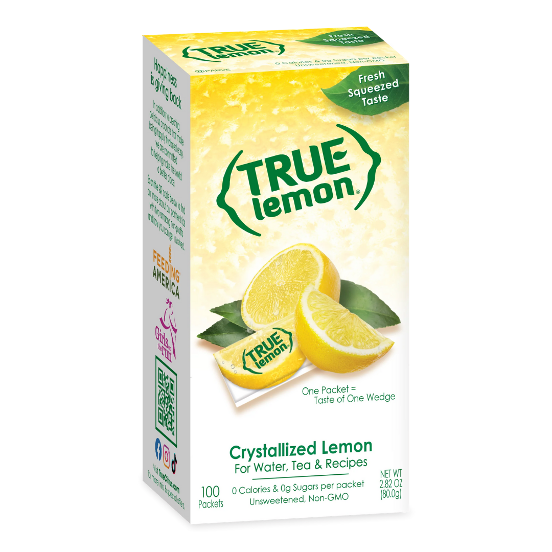 True Lemon Fresh Squeezed Taste comes in 100 packets, totaling 2.82 oz (80 g). Each packet delivers the flavor of one lemon wedge, made from crystallized lemon juice, citric acid, and lemon oil. It’s zero-calorie, sugar-free, and contains no artificial sweeteners. Perfect for adding fresh lemon taste to water, tea, or recipes on the go. Convenient, all-natural, and diet-friendly, this pack is great for enhancing drinks or meals anytime.