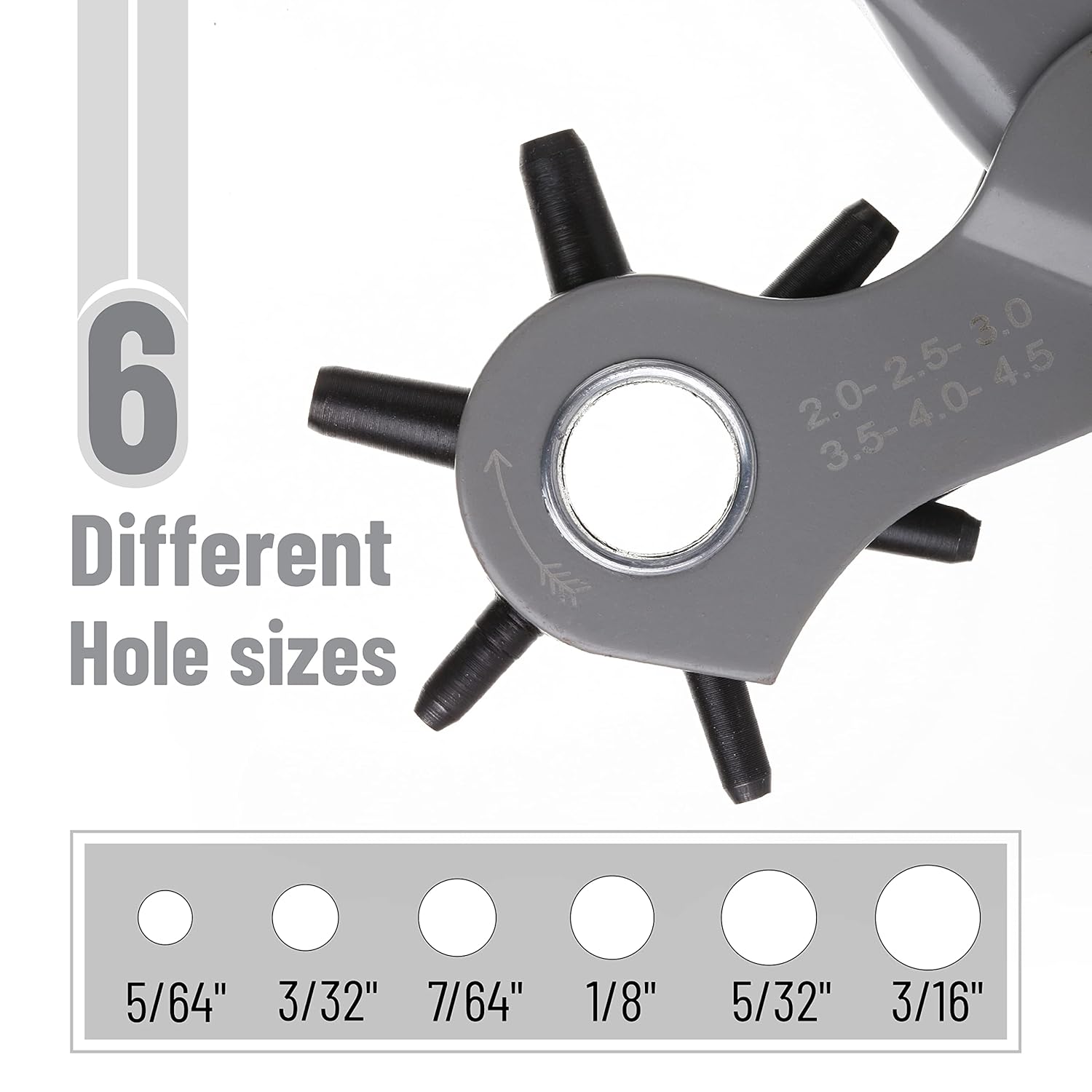 The UNCO Leather Hole Punch Tool includes one tool designed to adjust belts to your perfect fit. Made of durable plated steel, it features a sharp, circular edge for strong, clean punches. With 6 different hole sizes, this tool is great for both home and commercial use. It’s self-opening, revolving, and easy to operate, making it accessible for everyone. Ideal for punching round holes in materials like leather, belts, plastic, rubber, canvas, fabric, and cardboard. Simply unlock the handle, rotate the wheel to select the size, and squeeze to punch.