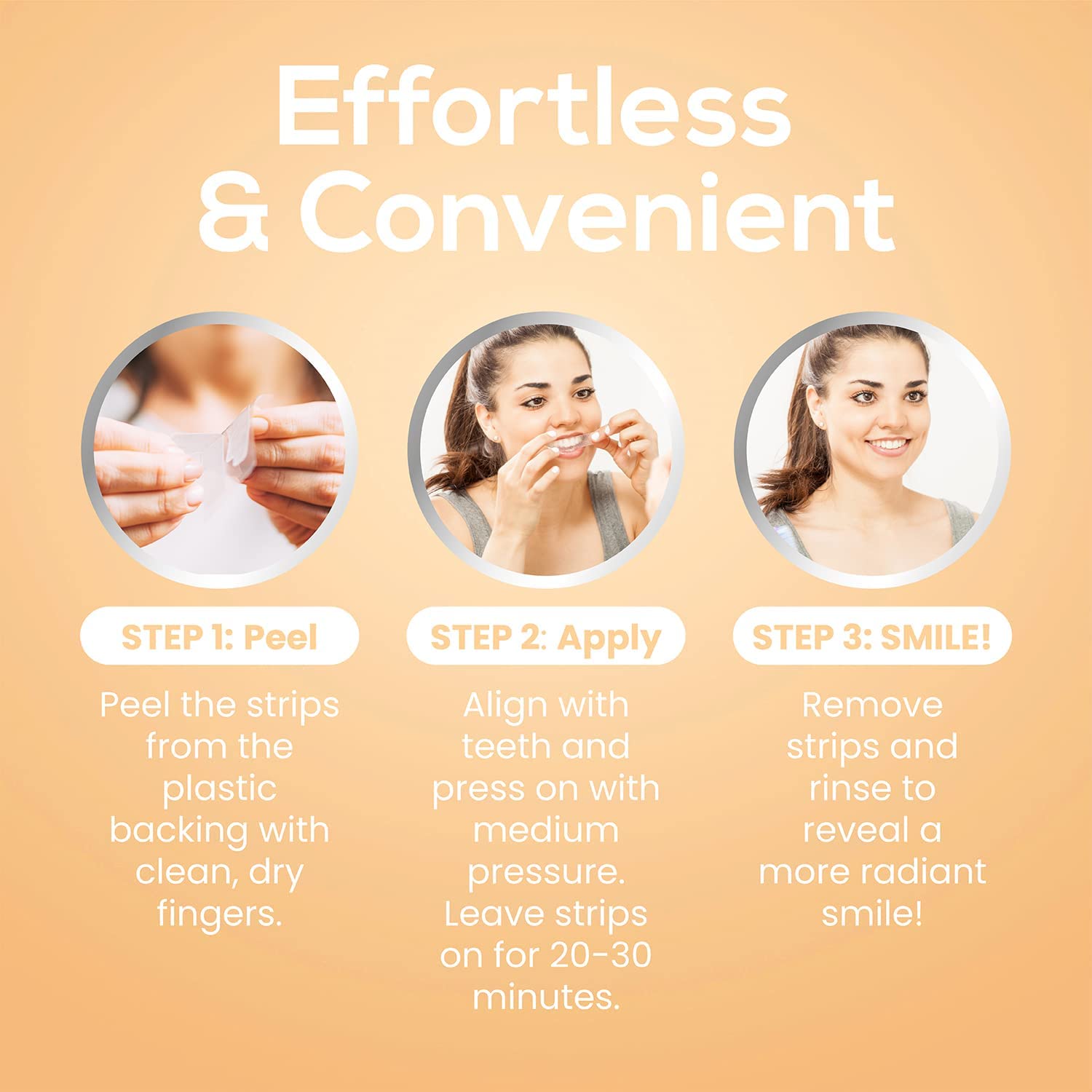 - EFFORTLESS AND CONVENIENT: Achieving a brightened smile should be effortless! Use our whitening strips from the comfort of your own home or last minute before an important event, all without the hassle of visiting the dentist and breaking the bank.