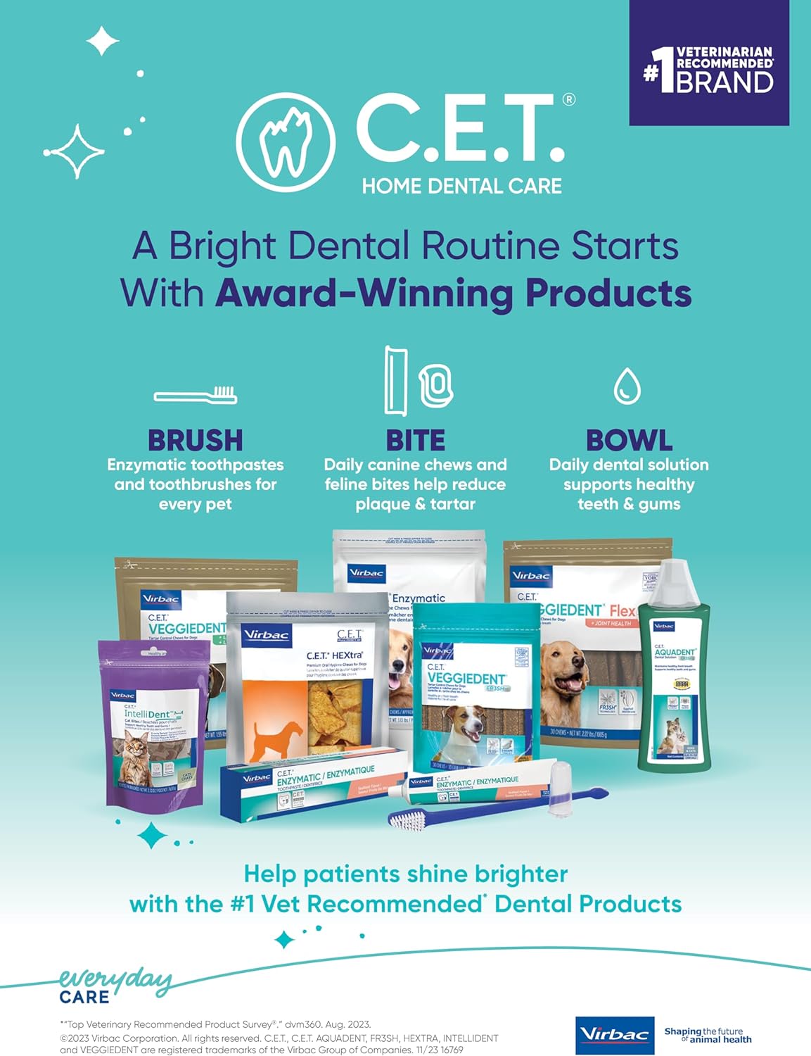 Virbac C.E.T. Enzymatic Oral Hygiene Chews for Dogs are a single-layer, 100% beef rawhide in an appealing poultry flavor. These vet-recommended chews feature the exclusive Dual Enzyme System to combine a natural antiseptic plus an abrasive texture that works with the dog's chewing action to remove tartar and provide plaque control. They help keep teeth clean and freshen breath, even on days when brushing isn't possible. Virbac C.E.T Enzymatic Oral Hygiene Chews should be given to dogs once a day for best results. Available in four sizes: Extra small, small, medium, and large. Swallowing whole chews will reduce the efficacy and can be harmful to your dog. This product is intended for intermittent or supplemental feeding only. Please only use under supervision. As with any pet product, it is not intended for human consumption, please keep out of the reach of children and wash hands after handling.