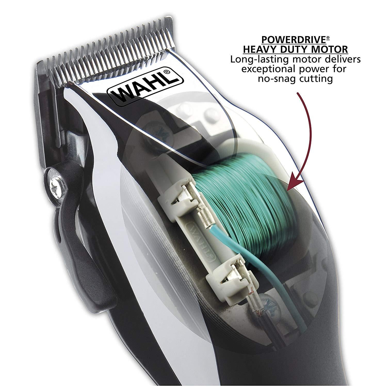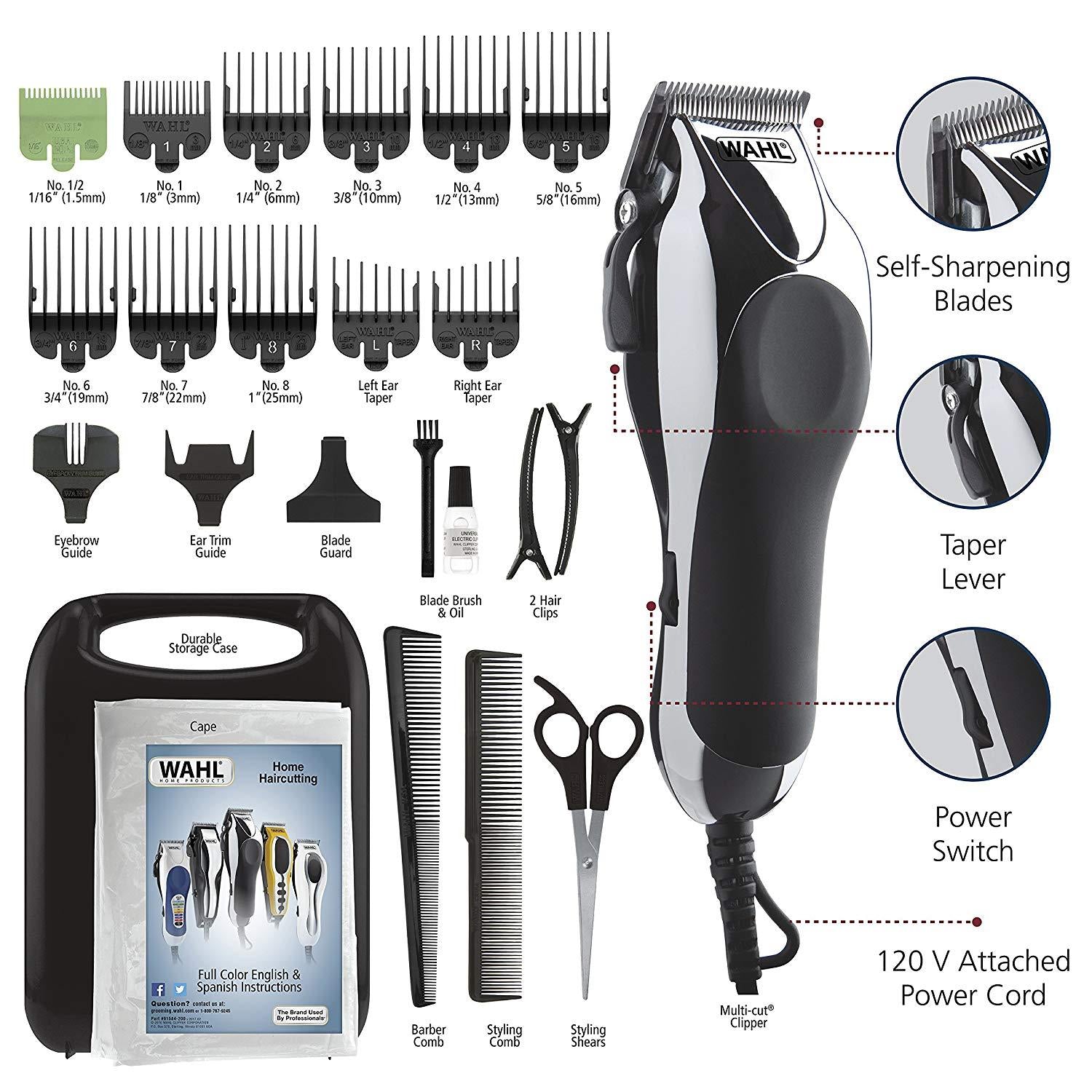 - Trips to the hair stylist can really add up. This 24-piece home haircutting kit from Wahl gives the whole family professional-looking haircuts for a fraction of the cost. The powerful clippers are useful for giving crew cuts and maintaining shorter haircuts. The clippers have a high-speed PowerDrive motor, which gives a smoother cut on thick hair. However, for the extent of its power, the motor is fairly quiet and lightweight. A comfortable grip makes the clippers easy to hold for a long period of time and a "Dura Chrome" finish gives them that retro-barber-shop look. The clippers high-carbon steel blades are permanently aligned so you never need to adjust them, and are detachable for thorough cleaning. The clippers come with 10 adjustable guide combs and a sliding thumb-operated switch on the clippers lets you easily adjust the combs to the proper height. Besides the clippers and guide combs, other accessories in the kit include a barber comb; small flattop comb; pocket comb; barber scissors for trimming bangs or stray hairs; two hair clips; a cape; neck duster; instructional video; and a blade guard, a cleaning brush, and extra oil for the electric clippers.