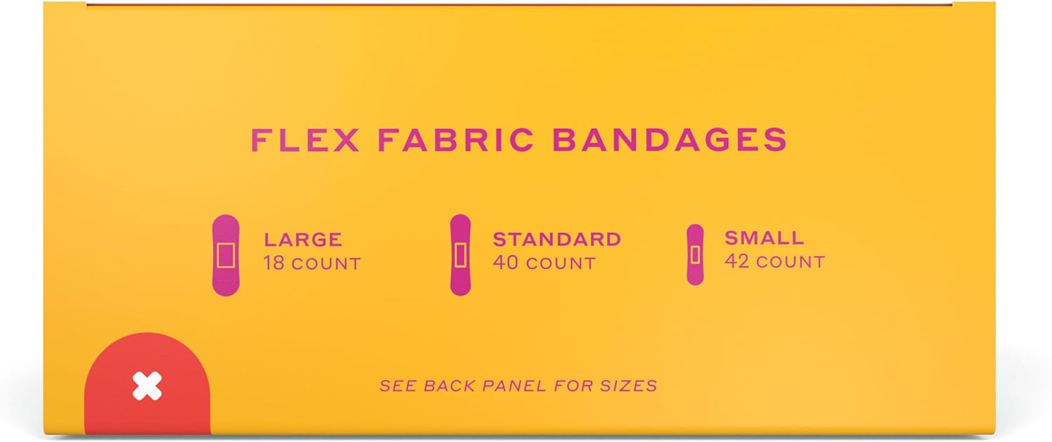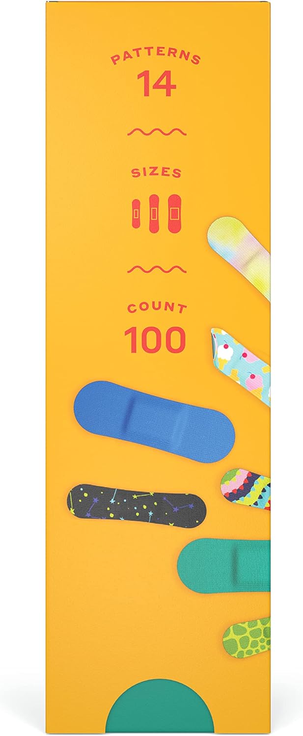 Specially designed bandages for tricky-to-cover areas, 100 count flex fabric bandages, 3 different sizes; 14 unique colors and patterns to help you wear your bumps and cuts with pride . Sealed on all 4 sides to protect from germs and dirt. Perfect for refilling your empty Welly tin