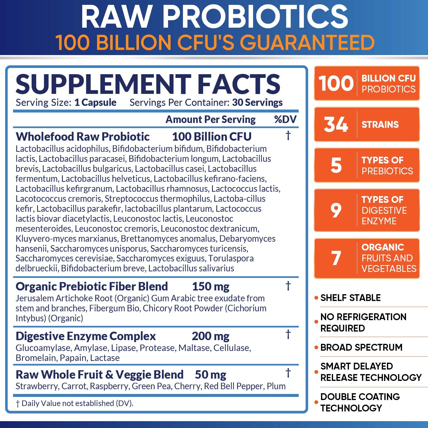 Wholesome Wellness Probiotics 100 Billion CFU for Men and Women with Prebiotics & Digestive Enzymes, 30 Capsules