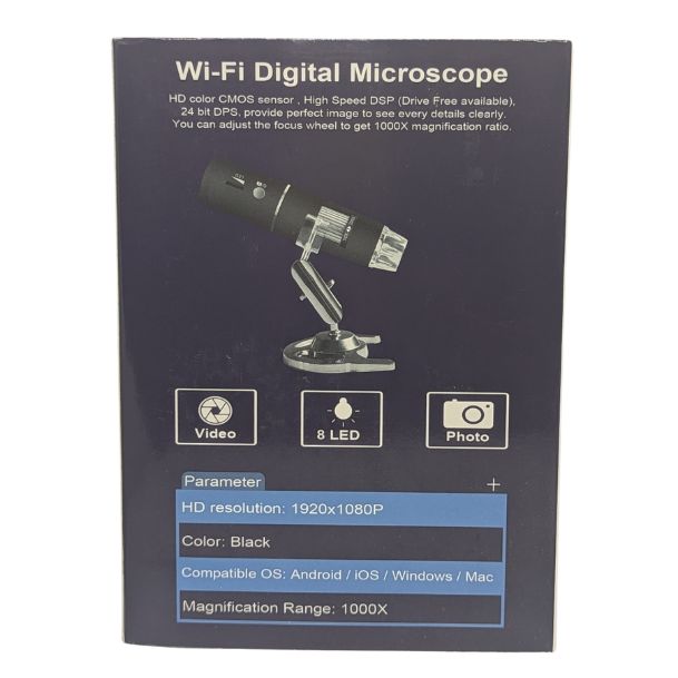 This is a wireless handheld digital microscope compatible with Android, iOS, Windows, and Mac devices. Connect to your phone using the “Max-see” app or use a USB cable for computers. Features 8 adjustable LED lights and a 2MP HD CMOS sensor for 1080P images on phones and 720P on PCs. Capture photos or videos with one button. Compact and portable, ideal for kids and hobbyists. Use "AMCap" for Windows 7/8, built-in Camera for Windows 10, and Photo Booth or QuickTime for Mac.