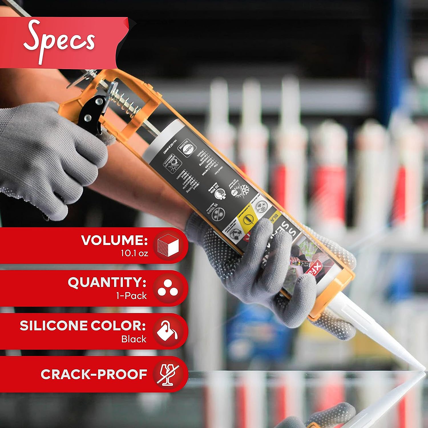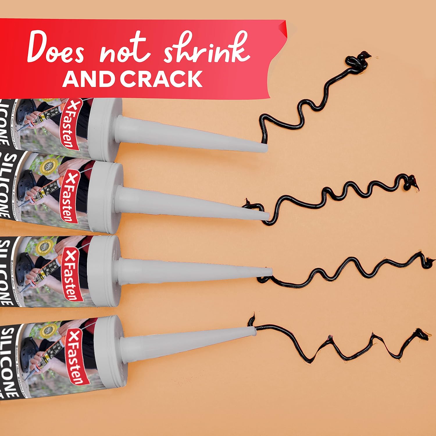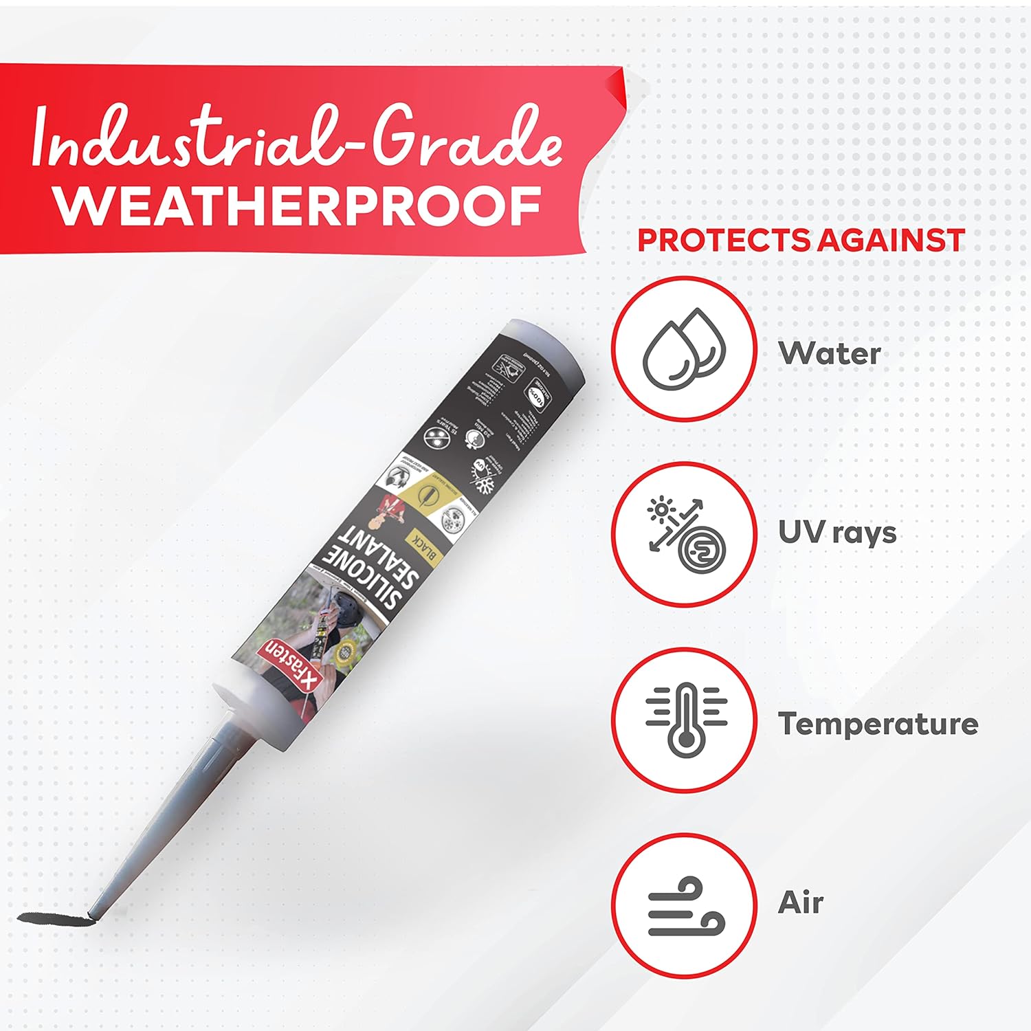 XFasten Silicone Sealant Waterproof Black Cartridge, 10.1 oz (Single Pack) Bl... Product Overview Size: Single Pack (10.1oz) Read more Read more XFasten Silicone Sealant XFasten Silicone Sealant XFasten Butyl Seal Tape XFasten Butyl Seal Tape XFasten Butyl Seal Tape XFasten Seal Repair Tape Color Black Black Black White Gray Black Quantity 4 Canisters 8 Canisters 1 Roll 1 Roll 1 Roll 1 Roll Volume 10 oz 10 oz Thickness 1/8" 1/8" 1/8" Width 3/4" 3/4" 3/4" 4" Length 30 Foot 30 Foot 30 Foot 10 Foot Features INDUSTRIAL-GRADE WEATHERPROOF black silicone sealant that offers maximum protection against water damage, leaks, drips, UV, extreme heat, and pressure for both indoor and outdoor environment on most surfaces like metal, granite, stone, wood and glass. RATED TO PROTECT UP TO 15 YEARS. This black silicone sealant adhesive is laboratory tested and rated to provide protection against dark spots, stains and other damage and stains caused by weather, water leaks, drips and heat. EASY TO APPLY BLACK SILICONE CAULK CATRIDGE. The XFasten Waterproof Black Silicone Caulk is packed inside a high-pressure resistant cartridge that is equipped with a jam-resistant nozzle for easy and smooth application.